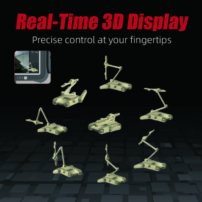 Poiché i robot disinnescanti spesso operano al di là della linea di visibilità durante le missioni, le informazioni in tempo reale sugli angoli e sulle posizioni spaziali delle articolazioni del robot sono cruciali per gli operatori. The REOD450 uses high-speed links and advanced computer technology to not only achieve real-time feedback of the robot's status information but also to employ leading 3D virtual display technology for remote real-time display of the robot's 3D statusQuesto fa sì che il robot si senta "vicino" anche quando è "lontano", consentendo un funzionamento più intuitivo.