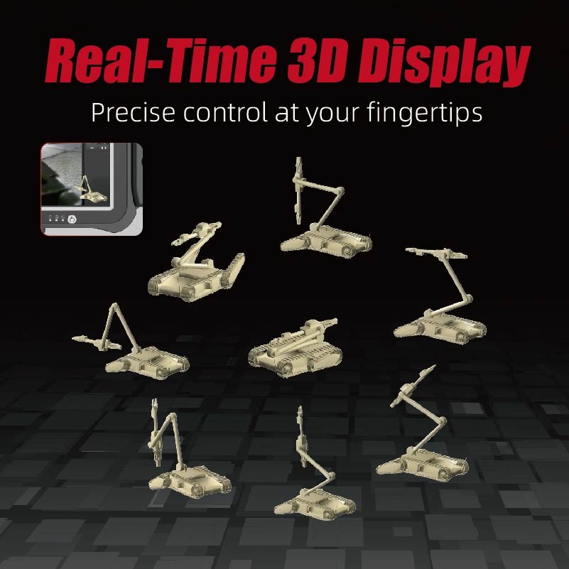 Poiché i robot disinnescanti spesso operano al di là della linea di visibilità durante le missioni, le informazioni in tempo reale sugli angoli e sulle posizioni spaziali delle articolazioni del robot sono cruciali per gli operatori. The REOD400 uses high-speed links and advanced computer technology to not only achieve real-time feedback of the robot's status information but also to employ leading 3D virtual display technology for remote real-time display of the robot's 3D statusQuesto fa sì che il robot si senta "vicino" anche quando è "lontano", consentendo un funzionamento più intuitivo.