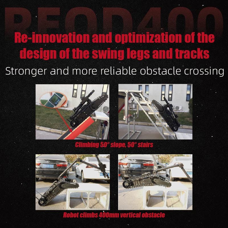 Il robot REOD400 EOD è una soluzione avanzata per lo smaltimento di ordigni esplosivi (EOD) in ambienti ad alto rischio.rendendolo altamente efficiente per operazioni come il terrorismo urbanoIl robot è compatto e leggero, con dimensioni di ≤830 mm × 600 mm × 460 mm (completamente riempito) e un peso di ≤37 kg.ha una velocità massima ≥ 10,8 m/s con 5 marce e azionamento continuo variabile, distanza da ostacoli ≥ 300 mm e capacità di graduazione e di salita delle scale fino a 45°,garantire una manovrabilità e una capacità di adattamento superiori in vari terreni.