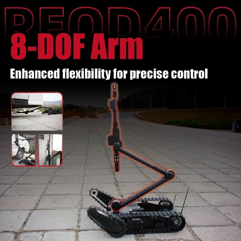 Il braccio robotico REOD400 presenta un design integrato a 8 gradi di libertà, fornendo forti capacità di raggiungimento spaziale.Questa progettazione consente al braccio robotico di svolgere non solo compiti di smaltimento di bombe convenzionali, ma anche operazioni che i normali robot di smaltimento di bombe a 5 o 6 gradi di libertà non possono gestire, come afferrare oggetti in ambienti alti, bassi e profondi, o in ambienti di tavolo, nonché condurre ricognizione multiangolare in ambienti alti, bassi e profondi.